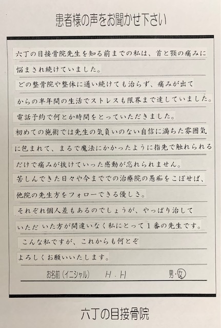 六丁の目接骨院先生を知る前までの私は、首と顎の痛みに悩まされ続けていました。どの整骨院や整体に通い続けても治らず、痛みが出てからの半年間の生活でストレスも限界まで達していました。電話予約で何とか時間をとっていただきました。初めての施術では先生の気負いのない自信に満ちた雰囲気に包まれて、まるで魔法にかかったように指先で触れられるだけで痛みが抜けていった感動が忘れられません。苦しんできた日々や今までの治療院の愚痴をこぼせば、他院の先生方をフォローできる優しさ。それぞれ個人差もあるのでしょうが、やっぱり治していただいた方が間違いなく私にとって一番の先生です。こんな私ですが、これからも何とぞよろしくお願いいたします。