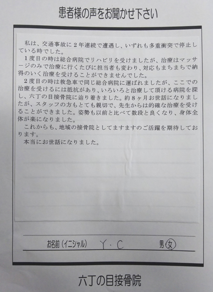 2度目の時は救急車で同じ総合病院に運ばれましたが、ここでの施術を受けるには抵抗があり、いろいろと施術して頂ける病院を探し、六丁の目接骨院に辿り着きました。約8カ月お世話になりましたが、スタッフの方もとても親切で、先生からは的確な施術を受けることが出来ました。姿勢も以前と比べて数段と良くなり、身体全体が楽になりました。これからも、地域の接骨院としてますますのご活躍を期待しております。本当にお世話になりました。